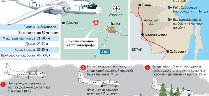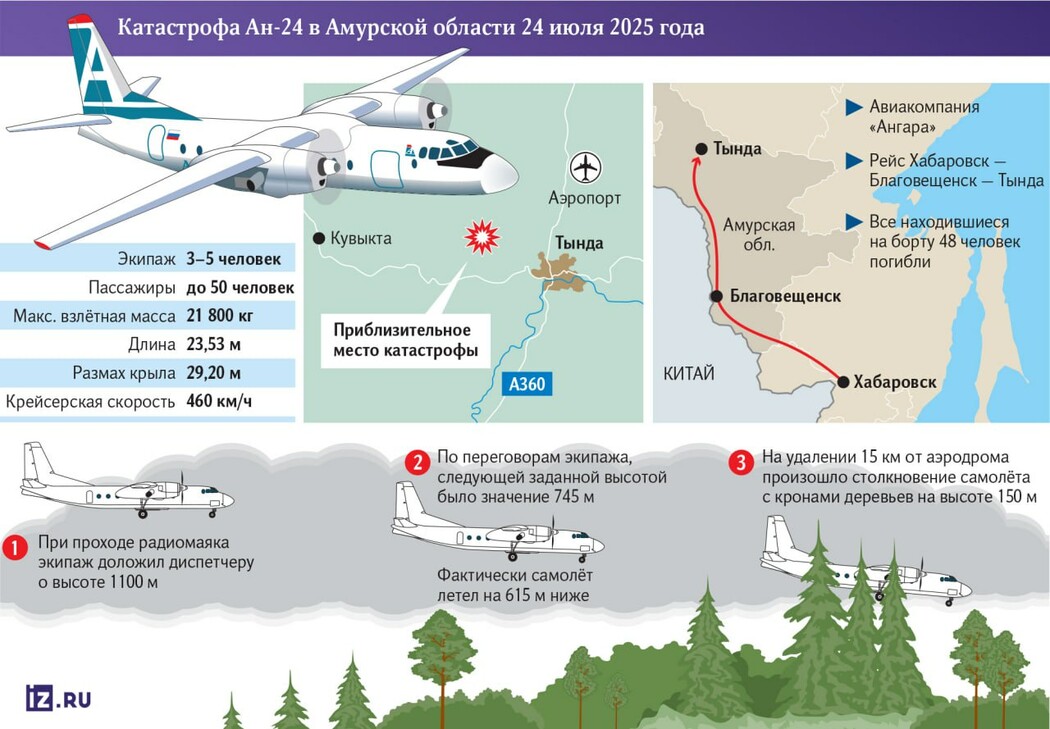 Согласно информации, полученной изданием «Известия» из письма главы Росавиации, предполагаемой причиной крушения Ан-24 в Амурской области стало некорректное использование систем измерения высоты. Отмечается, что во время снижения экипаж установил на высотомерах показания давления по международной системе QNH, но при докладе диспетчеру о прохождении контрольной точки сообщил высоту, соответствующую «советской» системе QFE. В письме указывается, что самолет на высоте всего 150 метров над уровнем аэродрома столкнулся с верхушками деревьев на возвышенности, что привело к его разрушению, возгоранию и гибели всех, кто был на борту.
