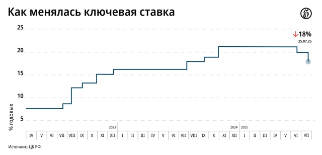 Согласно собственным прогнозам Банка России, к концу года средняя ключевая ставка будет находиться ниже 20%. Следующее заседание регулятора запланировано на 12 сентября. В течение летнего периода ЦБ уже дважды снижал показатель, последний раз – до 18%, объясняя свои решения позитивными изменениями в инфляционной динамике.