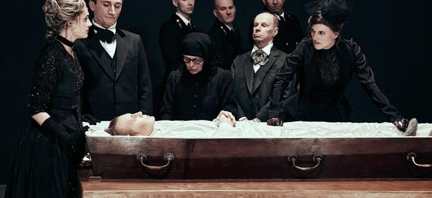 Траурная мелодия, будто с заезженной грампластинки, наполняет пространство, создавая симфонию звуков, шорохов и едва уловимых отголосков минувшей жизни. Этот прием напоминает о музыкальных партитурах ранних спектаклей Валерия Фокина, в частности, о «Нумере в гостинице города NN» 1990-х годов, которые так завораживали. Реакция зала неоднозначна: кто-то испытывает ужас, кто-то – смех. В памяти всплывают слова Киры Муратовой о том, почему дети порой неестественно смеются на похоронах – из-за неловкости и незнания, как себя вести. Теперь же и взрослая аудитория демонстрирует подобную детскую реакцию. В отдельные моменты происходящее становится трагикомичным, словно «веселые похороны», но это ощущение приходит не сразу.