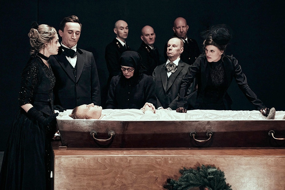 Малая сцена превращена в камерный траурный зал: стены массивны и мрачны, посредине — еще незанятый катафалк, в напольных вазах — искусственные цветы. Зрительские букеты темных роз органично вплетаются в общую скорбную атмосферу. Сценография Алексея Трегубова намеренно лишена индивидуальности и максимально функциональна. В черных одеждах суетятся люди, ожидая усопшего. Затем рабочие сцены вносят гроб, на их униформе читается надпись «Ритуальные услуги». Остальные персонажи, одетые в костюмы своего времени, дополняют картину. Примечательна современная деталь: у одного из присутствующих раздается звонок мобильного, заставляя зрителей искать забывчивого владельца. Этот незнакомец, подобно стороннему наблюдателю, будто ведет отсчет уходящего времени.