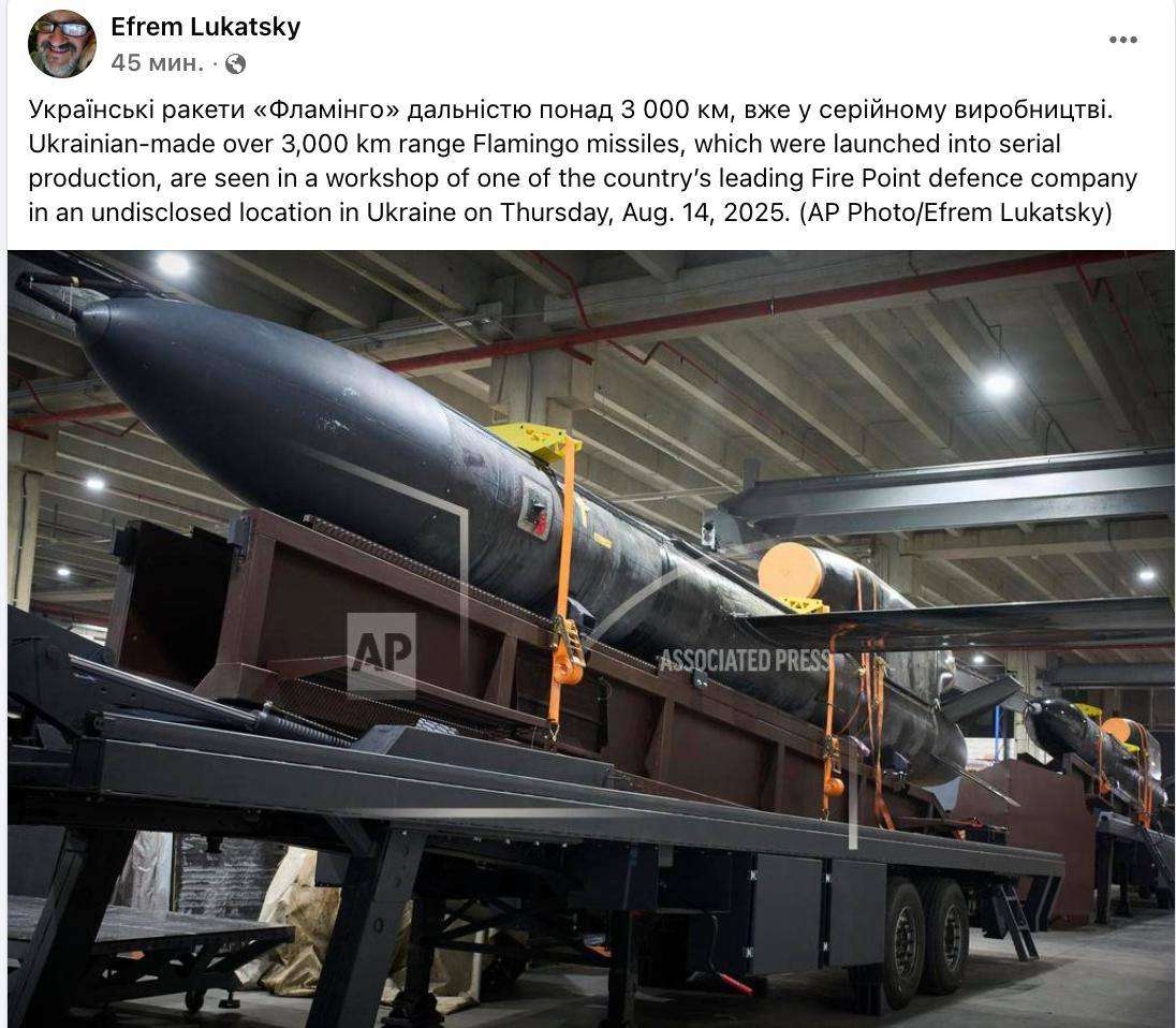 Агентство Associated Press опубликовало первый снимок новой украинской крылатой ракеты, которую фотограф Ефрем Лукацкий идентифицировал как «Фламинго». По утверждениям Лукацкого, ракета уже запущена в серийное производство и обладает дальностью полета до трех тысяч километров. Однако официальные источники пока не подтвердили эту информацию.