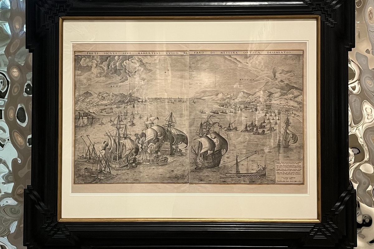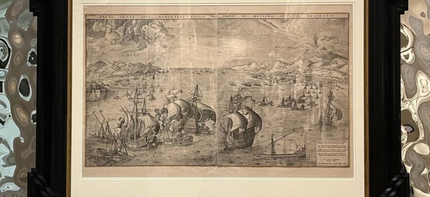 Особый интерес вызывает историческая основа произведения. Композиция гравюры опирается на зарисовки, сделанные Брейгелем Старшим во время его путешествия по Италии. Перед зрителем разворачивается масштабная панорама Мессинского пролива, заполненная многочисленными кораблями и детализированными элементами. Существует предположение, что гравюра может изображать событие 1552 года — эпизод Итальянской войны, где противостояли итальянский и франко-турецкий флоты. Было ли это событие непосредственно увидено самим художником, остаётся неизвестным.