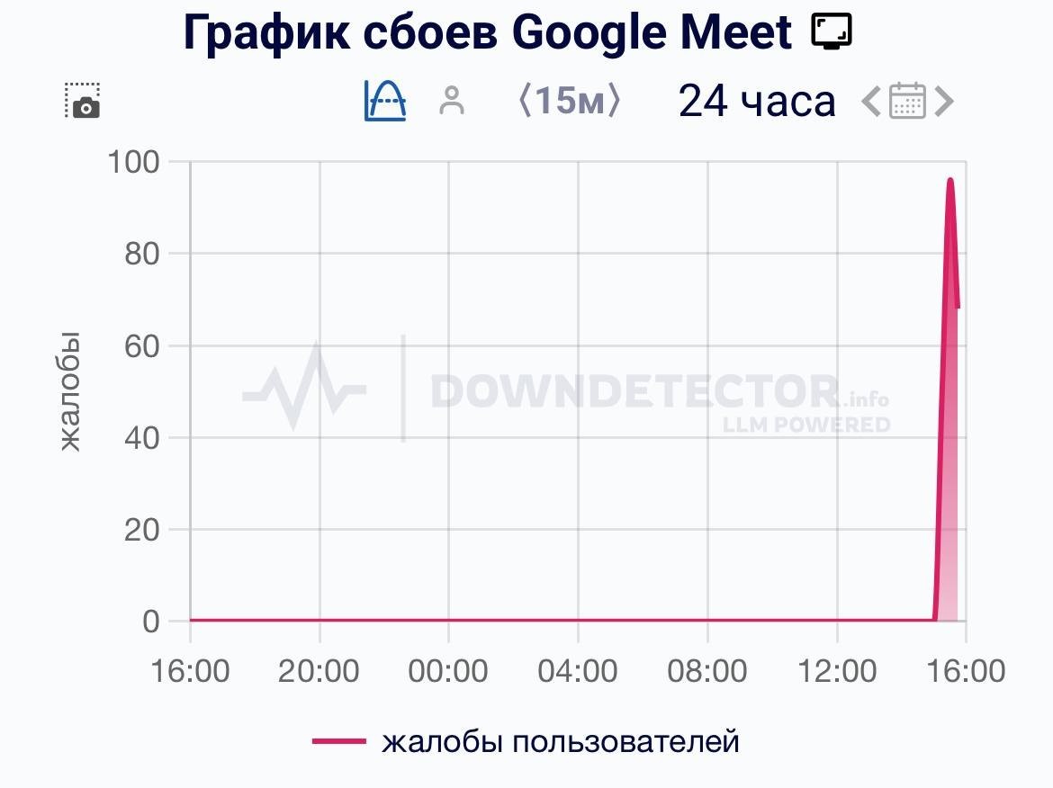 Пользователи в России массово жалуются на перебои в работе сервиса Google Meet, согласно данным Downdetector. Сообщения свидетельствуют о невозможности начать звонок или отсутствии звука при соединении. Некоторые пользователи отмечают, что текстовые сообщения отправляются, но видео- и аудиосвязь не функционирует.